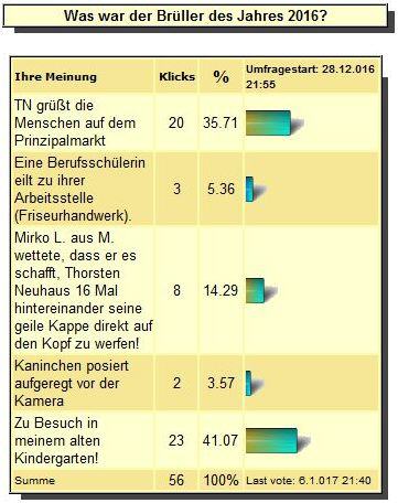10. JANUAR 2017: Endlich ist das Ergebnis da! Nach einem dramatischen, nie da gewesenen Finale steht der Brüller des Jahres 2016 fest. 41,07 Prozent aller Teilnehmer votierten für den Sieger! "Ich freue mich insbesondere, dass es bei der Gesamtzahl der abgegebenen Stimmen einen Allzeit-Rekord gab", erklärte Thorsten Neuhaus. "Dies unterstreicht die Bedeutung, die die Brüller-des-Jahres-Wahl inzwischen weltweit genießt. Zudem ist es natürlich ein Ansporn für mich, auch in diesem Jahr wieder brüllerhafte Ereignisse zu produzieren!"