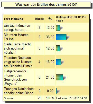 19. JANUAR 2016: Die Wahl ist entschieden, das Resultat eindeutig: Thorsten Neuhaus hat mit seiner Keyboard-Live-Performance von "Mit roten Haaren" eindrucksvolle 36 Prozent der Abstimmungsteilnehmer überzeugt! "Nach meinem Dafürhalten hätte jeder Kandidat den Sieg verdient gehabt", kommentierte Neuhaus. "Das klare Votum für meinen Evergreen erfreut mich selbstverständlich sehr." Besonders angetan zeigte der Wettbewerbsveranstalter sich angesichts der erstmaligen Brüller-Wahl-Beteiligung zahlreicher neuer TN-Online-Fans.