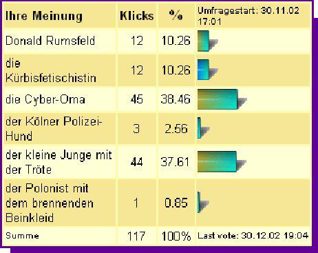 31. DEZEMBER 2002: Wahnsinn! Mit nur einer Stimme Vorsprung haben die TN-Online-Fans den "Liebling des Jahres" gekürt! Cyber-Oma Hildegard setzte sich mit 45:44 gegen den "Jungen mit der Tröte" durch, der damit den Titel "Newcomer des Jahres" verdient. Abgeschlagen folgen US-Kriegsminister Rumsfeld und die Kürbisfetischistin, lediglich als Zählkandidaten erwiesen sich der Kölner Polizeihund und der Polonist mit dem brennenden Beinkleid. In einer ersten Erklärung zeigte sich Hilde begeistert über das Abstimmungsresultat. "Ich werde es der Fangemeinde mit einem neuen Sprechgesangs-Hammer danken! Da ist was in der Pipeline", so die Cyber-Oma. Wir sind gespannt!