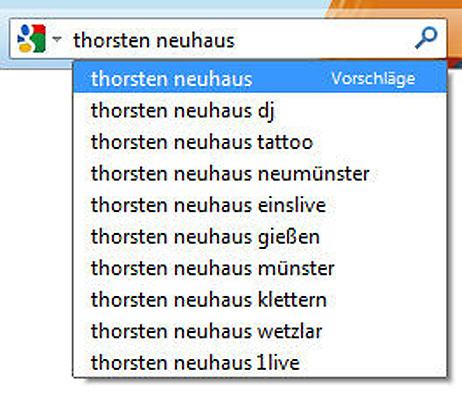 8. SEPTEMBER 2012: Die Google-Autocomplete-Funktion erregt nicht nur Deutschlands frühere First Lady. An diesem Wochenende wurde bekannt, dass auch Thorsten Neuhaus in Erwägung zieht, sich gegen den Internetgiganten zur Wehr zu setzen! "Meine großflächigen Tättowierungen sind allesamt an Stellen, die niemanden etwas angehen", erklärte Neuhaus sichtlich aufgebracht. Außerdem sei er kein Befürworter des Gießens und des Kletterns, so der Münsteraner weiter.