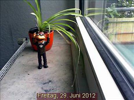 13. JULI 2012: Ein grauenhaftes Bild! Die weltweit beliebte Webcam-Sonnenblume hat sich angesichts fortschreitender Alterserscheinungen jetzt an einem Balkongeländer in Münster-Süd aufgehängt! "Ich hatte an jenem Abend bis weit nach Mitternacht Termine wahrzunehmen", so ein sichtlich betroffener Thorsten Neuhaus. "Als ich eintraf, war bereits alles zu spät", so der vertrauenerweckende Münsteraner weiter. Was mit den Samen der Sonnenblume geschieht und wie es um den lang ersehnten Zeitrafferfilm über das Leben der Kult-Pflanze steht, soll in den kommenden Tagen näher ausgeführt werden.